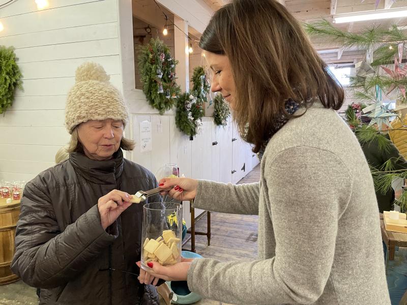 The Holiday Gift Shop, an artisan pop-up shop during Wiscasset Holiday Marketfest, invites shoppers to sample cookies, chocolates and honey. Wiscasset Holiday Marketfest photo