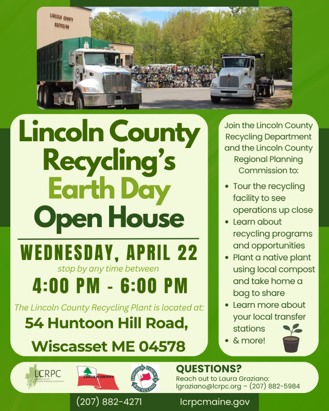 Celebrate Earth Day with a behind-the-scenes look at how recycling and composting work in Lincoln County. Lincoln County Regional Planning Commission invites the public to an Earth Day Open House at the Lincoln County Recycling Plant on Wednesday, April 22, from 4 to 6 p.m. at 54 Huntoon Hill Road in Wiscasset.