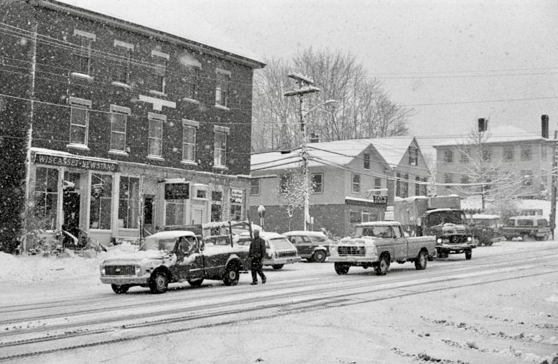 The first “Then” picture was taken by me 46 years ago, the week before Thanksgiving and during a blustery snowstorm. The camera was pointed at the historic Rundlett Block on Main Street that was built in 1871 with bricks made in Wiscasset. I was standing on the opposite side of Main Street in front of Whitfield’s Drug Store, now home to Wiscasset Bay Gallery. Depositor's Trust, a bank, was next door to the pharmacy. Wiscasset Newstand (newsstand is misspelled with just one “s”) was owned by Chet Bentley. Although Mr. Bentley was the owner it was Dot Lewis who usually manned the store. They sold newspapers, magazines, coffee, cigars and cigarettes. They also served as the ticket agent for the Greyhound bus service. Next door was Peter Rolfe’s art gallery, and on the corner was a gift shop – Wood Water and Wildthings.Further up the street is Tat’s Diner, owned by a woman named Tat Mitchell. Tat’s Diner was open for breakfast and lunch but is most remembered for Tat’s collection of eclectic bumper stickers she displayed on the rear wall over the kitchen. Although you can’t see it because of the delivery truck, Roland’s Barber Shop was next door to the diner. The “Now” picture, in living color, was taken this past Saturday. I think you’ll agree the biggest changes over the years have been the addition of the traffic signal at the Middle Street intersection and the brick sidewalks. Other than the addition of new windows, the Rundlett building looks pretty much the same.
