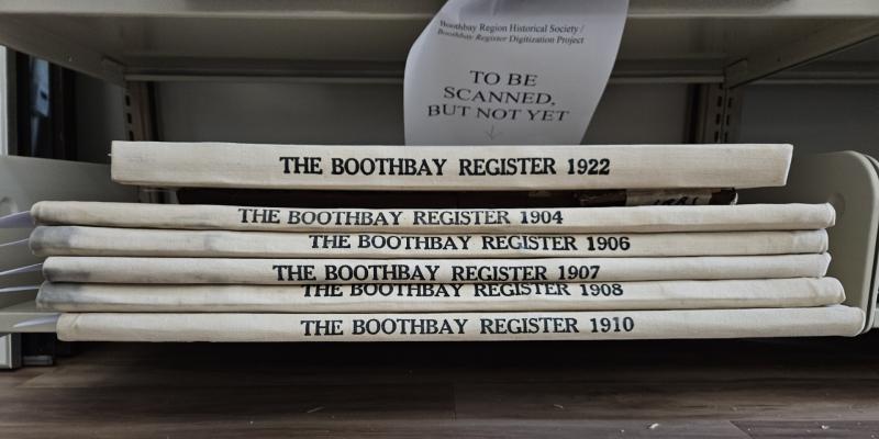 Volumes waiting to be scanned. Courtesy of Merritt BlakesleeIt's been a year since the Boothbay Register, in partnership with Boothbay Region Historical Society (BRHS), began our digitization project. The goal is to create an easily searchable, electronic catalog of all 150 years of Register history, from 1876 to 2013 (after which the paper began creating E-editions).