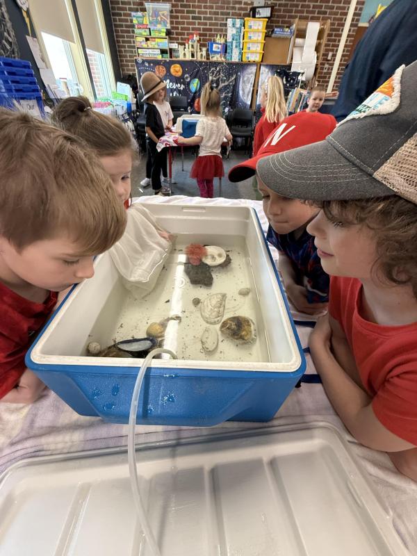 The students made their way around to each of the touch tanks, taking turns learning hands-on. One boy picked up a sea urchin and held it in both hands, completely still, watching its tiny tube feet move.